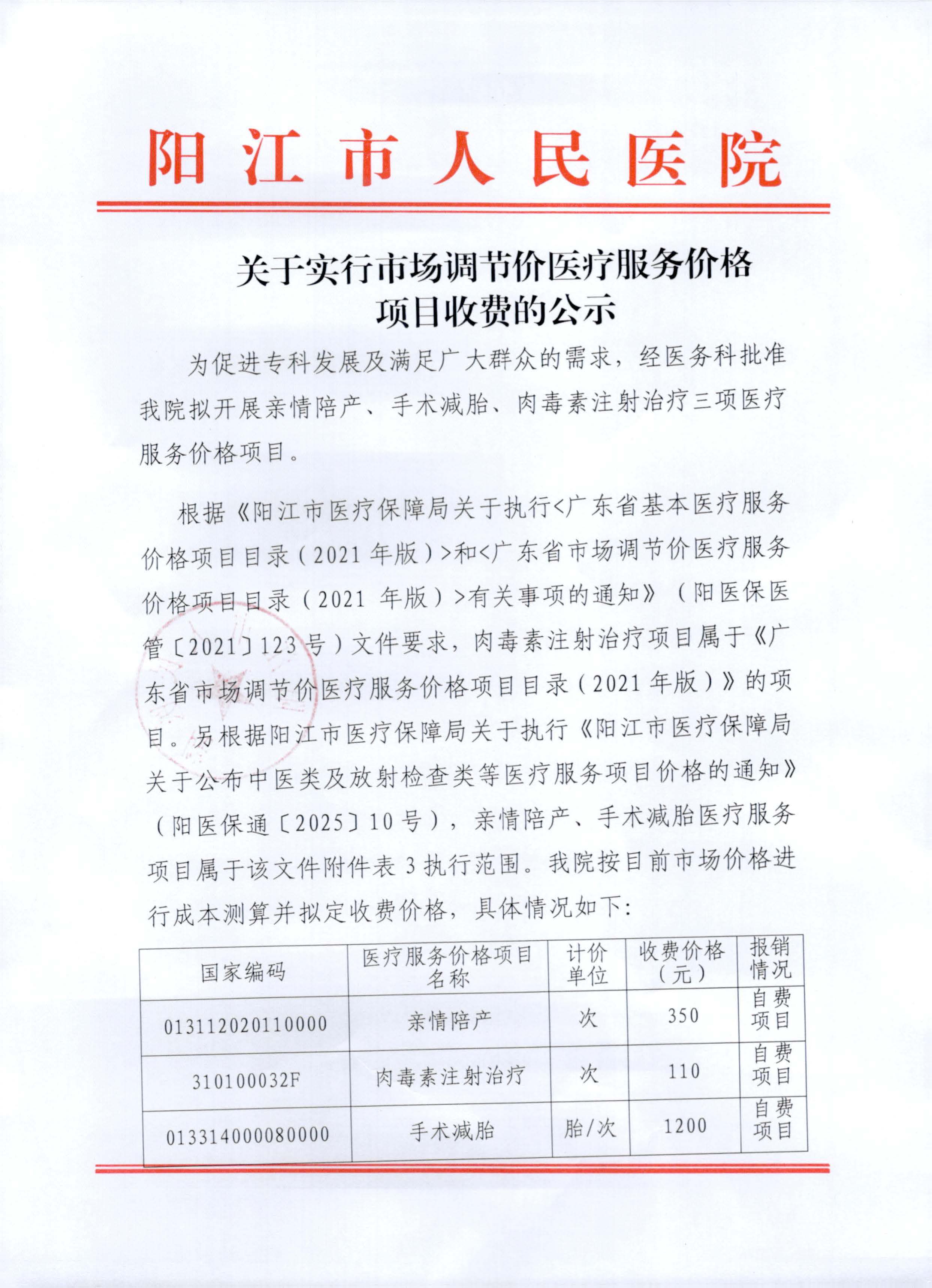 关于实行市场调节价医疗服务价格项目收费的公示20250915