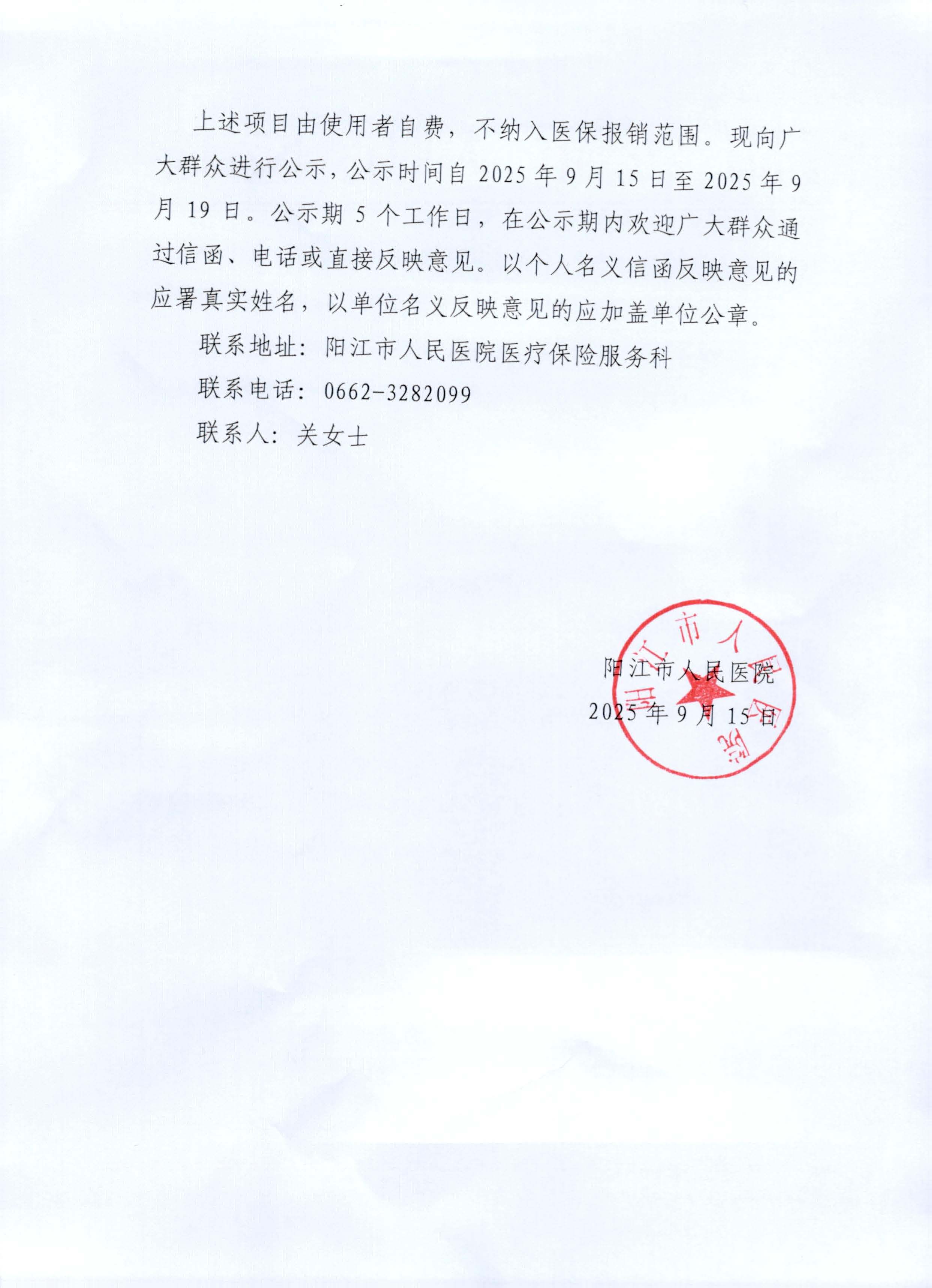 关于实行新增实行医疗服务价格项目收费的公示20250915